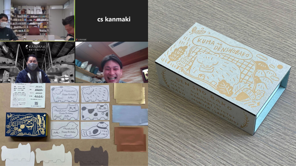 そうなんです。「ハクカクコ」は、和紙卸販売の株式会社オオウエ(大阪)、紙器製造のモリタ株式会社(札幌)、顔料箔製造の私たちKANMAKI(京都) が紙製文具雑貨を企画開発するプロジェクト。家業イノベーション・ラボのコミュニティを通じてお話をする中で、ペーパーレス時代の中で紙文化を発展させることに意気投合し、今回のコラボが決まったんです。第一弾商品として、文具の人気イベント「紙博東京2024」で「和紙のメッセージカード」とボールペンで描ける箔「煌葉-kiraha-」を、人気イラストレーター高旗将雄さんの描き下ろしデザインの特製紙箱カードケースにセットした『伝書箱』を発売しました。こうやって仲間たちと一緒に商品開発をできるのも嬉しいですね。